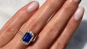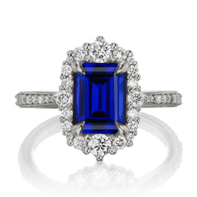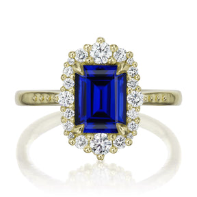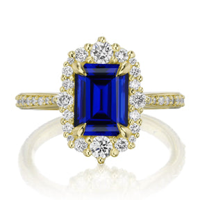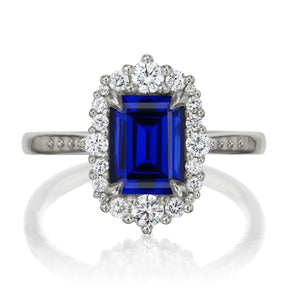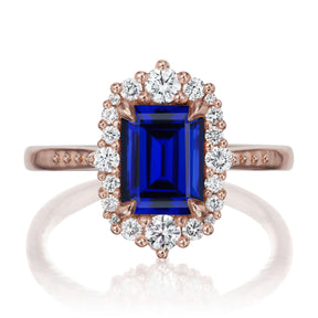 The vintage-inspired midsize Adeline makes a statement engagement ring or treat-yourself gift. Featuring an emerald cut Chatham® lab-grown blue sapphire, accented by conflict-free lab-grown or Canadian mined diamonds.