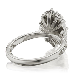 The shank, or the band portion of an engagement ring, can be crafted with or without diamonds set into it. Selecting no diamonds in the shank means the shank will feature decorative metal beading instead (see first example photo in above carousel). Selecting diamonds halfway around means the diamonds will extend halfway around the engagement ring’s shank (see second example photo). Selecting diamonds three-quarters around means the diamonds will extend three-quarters of the way around the engagement ring’s shank, leaving a small area in back to allow for future resizing (see final example photo).