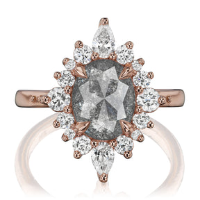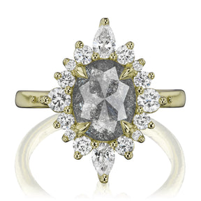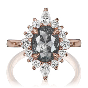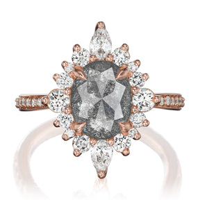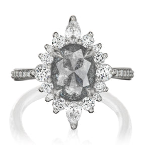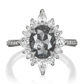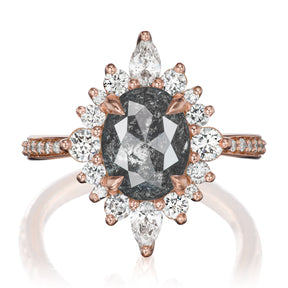 Create your own vintage-inspired large Anika engagement ring or treat yourself-gift! Featuring the one-of-a-kind Salt + Pepper diamond of your choice, accented by conflict-free lab-grown or Canadian mined diamonds. Scroll down for descriptions of each diamond; see photo of loose diamonds to select from.