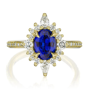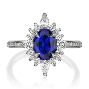 The vintage-inspired midsize Anika makes a statement engagement ring or treat-yourself gift. Featuring an oval Chatham® lab-grown blue sapphire center, accented by conflict-free lab-grown diamonds.