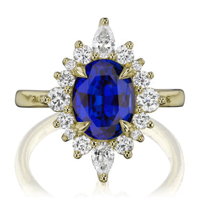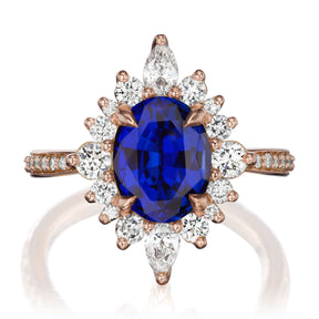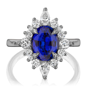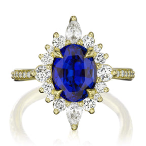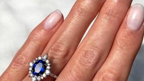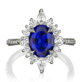 The vintage-inspired large Anika makes a statement engagement ring or treat-yourself gift. Featuring an oval Chatham® lab-grown blue sapphire center, accented by conflict-free lab-grown diamonds.