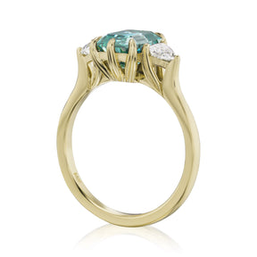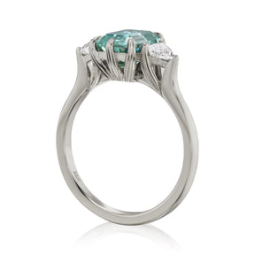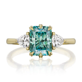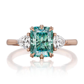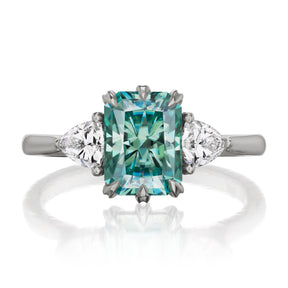 The Avery three-stone ring is the perfect blend of edgy-meets-classic. Featuring a radiant cut aqua-teal Iconic™ moissanite center, framed by conflict-free trillion shaped lab-grown diamonds. Aqua-teal moissanite is a more durable and sparkling alternative to an aquamarine gemstone, making it a perfect ring choice.