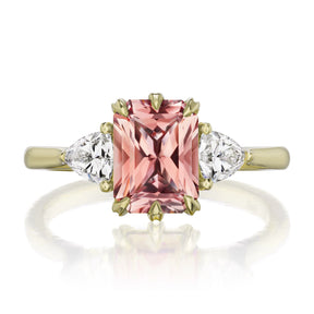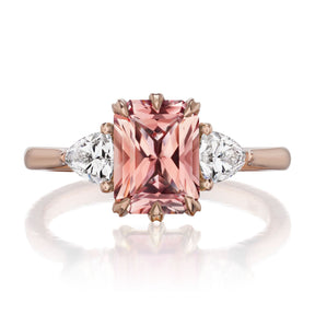 The Avery three-stone ring is the perfect blend of edgy-meets-classic. Featuring a radiant Chatham® lab-grown peach-champagne sapphire center, framed by conflict-free trillion shaped lab-grown diamonds.