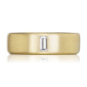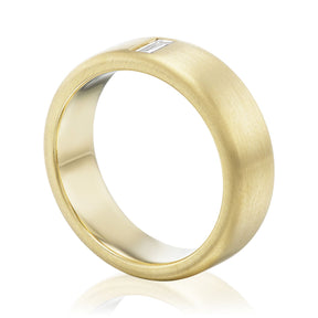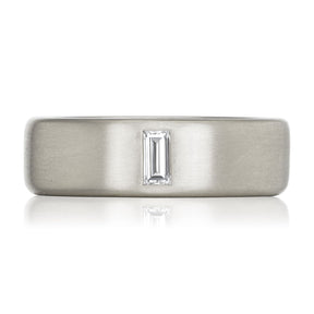 The wide Brooklyn band is the perfect mix of classic-meets-modern. Featuring a brushed matte satin finish with a contrasting brilliant white baguette shaped diamond, in your choice of lab-grown or conflict-free mined. This band is substantial in weight and feel, and so comfortable to wear.