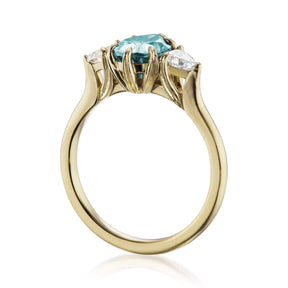 The Brynn three-stone ring is the perfect blend of edgy-meets-classic. Featuring an auqa-teal Iconic™ moissanite center, framed by conflict-free trillion shaped lab-grown diamonds. Aqua-teal moissanite is a more durable and sparkling alternative to an aquamarine gemstone, making it a perfect ring choice.