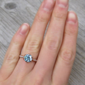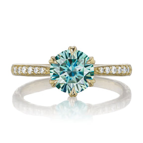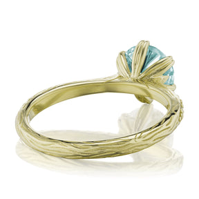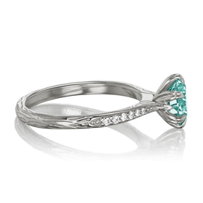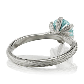 The Camille's leaf-inspired prong setting and twig textured shank put a unique twist on the classic solitaire design. Featuring a Hearts & Arrows Iconic™ aqua-teal moissanite, framed by conflict-free lab-grown or Canadian mined diamonds. Aqua-teal moissanite is a more durable and sparkling alternative to an aquamarine gemstone, making it a perfect engagement ring choice.