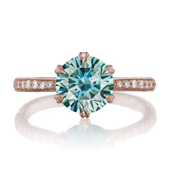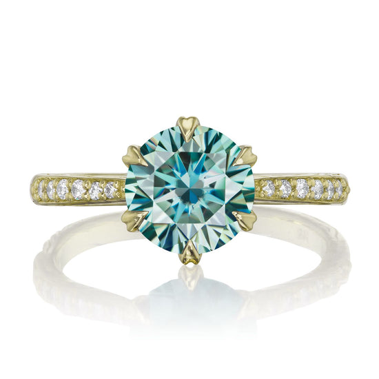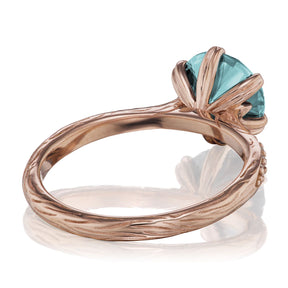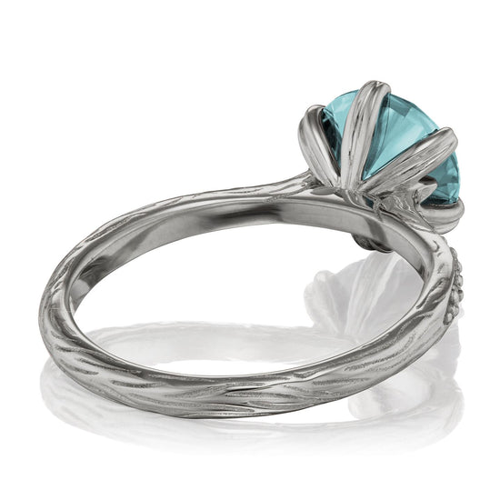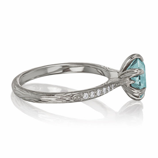 The Camille's leaf-inspired prong setting and twig textured shank put a unique twist on the classic solitaire design. Featuring a Hearts & Arrows Iconic™ aqua-teal moissanite, framed by conflict-free lab-grown or Canadian mined diamonds. Aqua-teal moissanite is a more durable and sparkling alternative to an aquamarine gemstone, making it a perfect engagement ring choice.