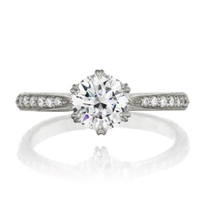 The Camille's leaf-inspired prong setting and twig textured shank put a unique twist on the classic solitaire design. Featuring an Everlūm™ lab-grown diamond center, framed by your choice of conflict-free lab-grown or Canadian mined diamonds.