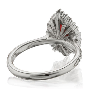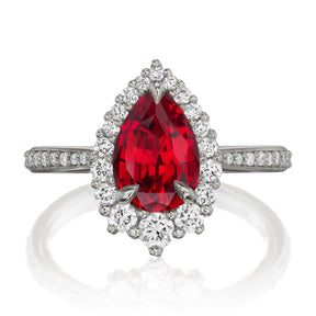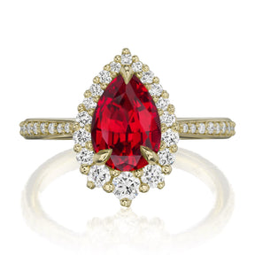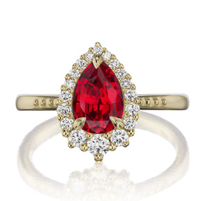 The vintage-inspired small Celeste makes a statement engagement ring or treat-yourself gift. Featuring a pear Chatham® lab-grown ruby, accented by conflict-free lab-grown or Canadian mined diamonds.