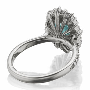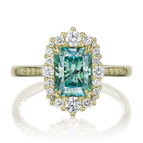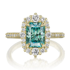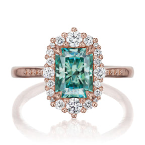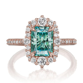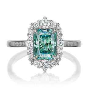 The vintage-inspired midsize Adeline makes a statement engagement ring or treat-yourself gift. Featuring a radiant cut aqua-teal Iconic™ moissanite center, accented by conflict-free lab-grown or Canadian mined diamonds. Aqua-teal moissanite is a more durable and sparkling alternative to an aquamarine gemstone, making it a perfect ring choice.