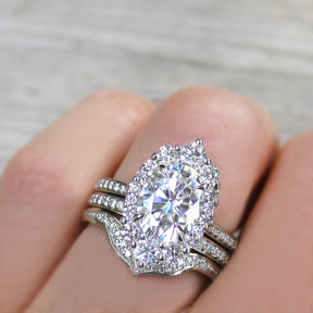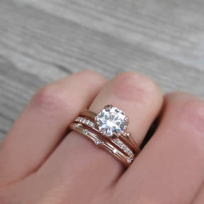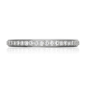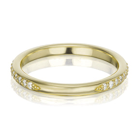 The Eleanor band features a row of conflict-free lab-grown or Canadian mined diamonds. Diamonds are set in the distance of your choice: halfway around, three-quarters of the way around, or fully around (eternity style). The Eleanor stacks flush alongside our halo and solitaire style rings.