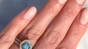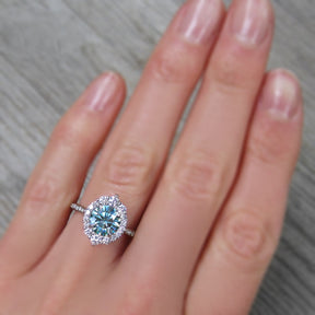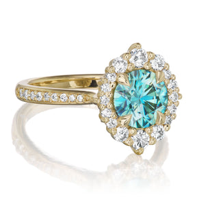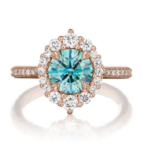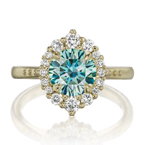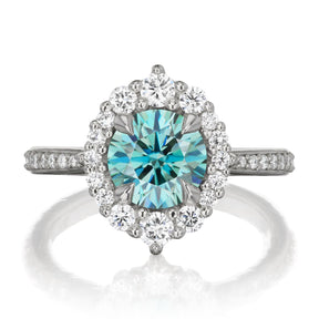 The vintage-inspired small Emerson makes a statement engagement ring or treat-yourself gift. Featuring a Hearts & Arrows aqua-teal Iconic™ moissanite center, accented by conflict-free lab-grown or Canadian mined diamonds. Aqua-teal moissanite is a more durable and sparkling alternative to an aquamarine gemstone, making it a perfect ring choice.