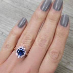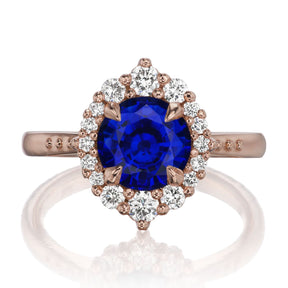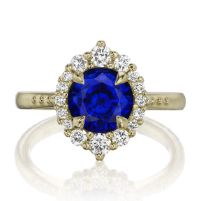 The vintage-inspired small Emerson makes a statement engagement ring or treat-yourself gift. Featuring a round Chatham® lab-grown blue sapphire center, accented by conflict-free lab-grown or Canadian mined diamonds.