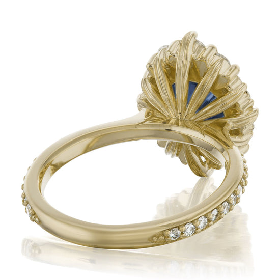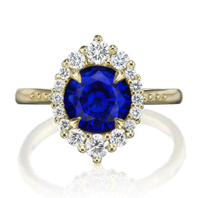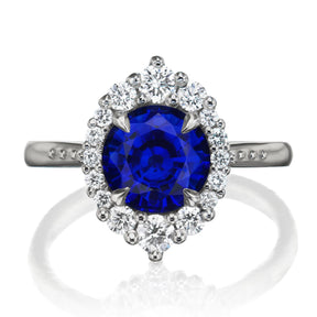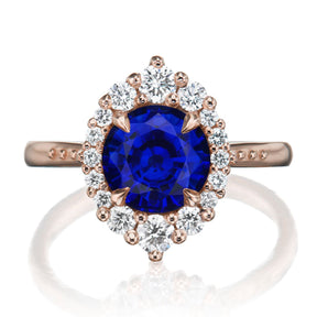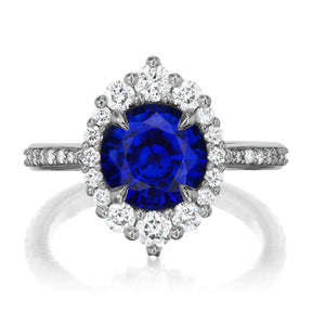The vintage-inspired midsize Emerson makes a statement engagement ring or treat-yourself gift. Featuring a round Chatham® lab-grown blue sapphire center, accented by conflict-free lab-grown or Canadian mined diamonds.