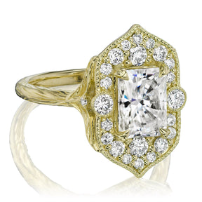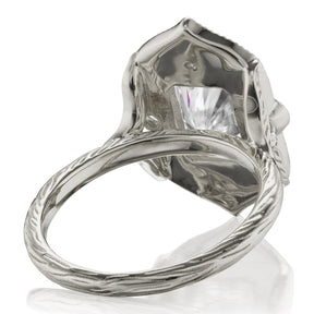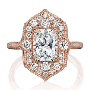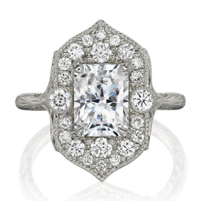 The vintage-inspired Estella makes a statement engagement ring or treat-yourself gift. Featuring a radiant cut lab-grown diamond center, accented by conflict-free lab-grown or Canadian mined diamonds. The shank features a twig and leaf motif with a tiny diamond nestled into each side, for the perfect combinations of modern-meets-antique.