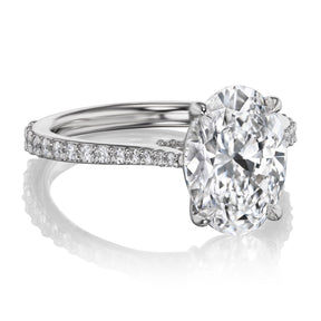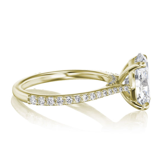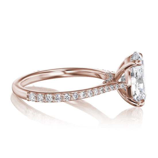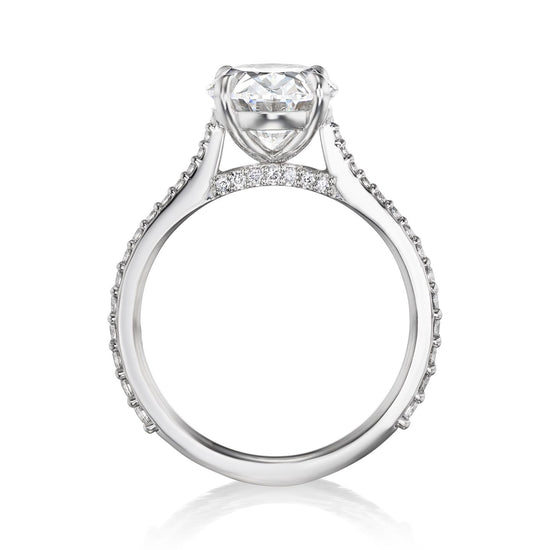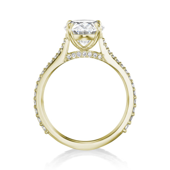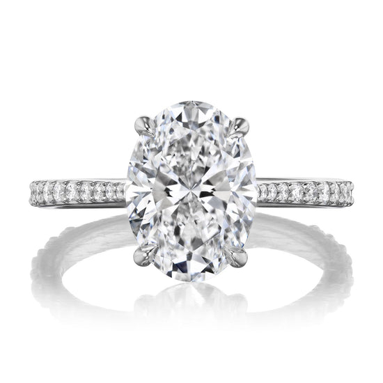 The Jessa is a modern and ethical take on a classic oval solitaire. Featuring an oval lab-grown diamond with hidden diamonds along the bridge. Available with or without diamonds in the shank, in your choice of conflict-free Canadian mined or lab-grown.