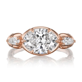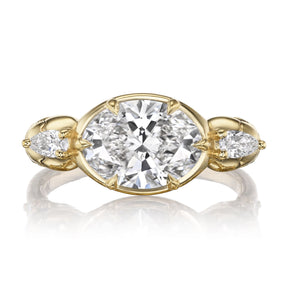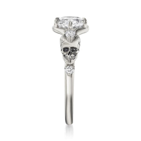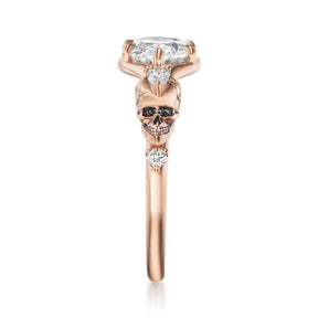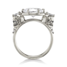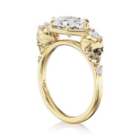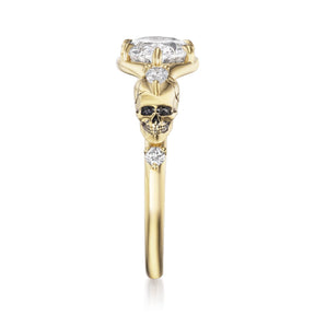 Part of the 'Til Death collection, the Juliet marries Kristin's aesthetic with inspiration from antique memento mori jewelry. Featuring intricate solid gold skulls that frame a floating east-west set 2ct oval lab-grown diamond. Each skull is adorned with a pear shaped diamond and additional shank diamond accents. Option to customize the shank stones with birthstones to symbolize the special souls in your life.