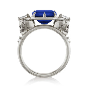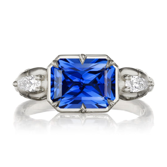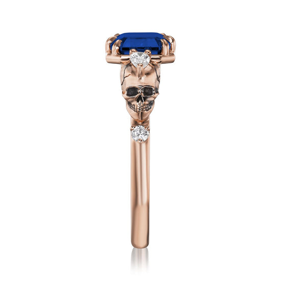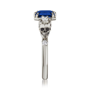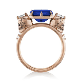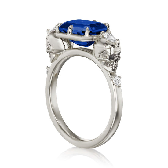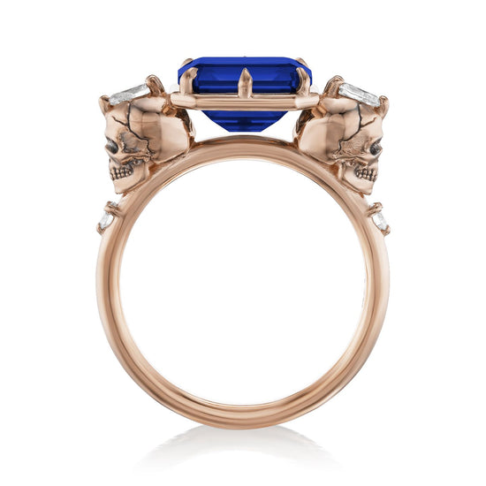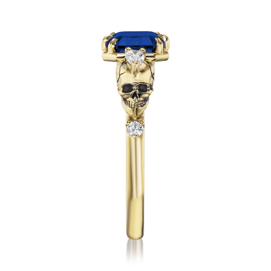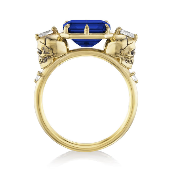 Part of the 'Til Death collection, the Juliet marries Kristin's aesthetic with inspiration from antique memento mori jewelry. Featuring intricate solid gold skulls that frame a floating east-west set radiant Chatham® lab-grown blue sapphire. Each skull is adorned with a pear shaped diamond and additional shank diamond accents. Option to customize the shank stones with birthstones to symbolize the special souls in your life.