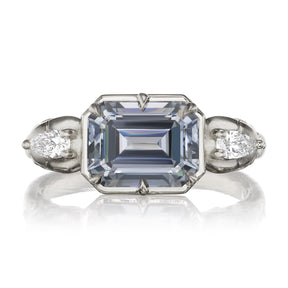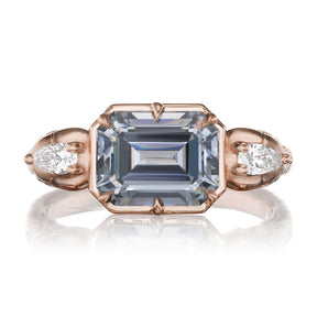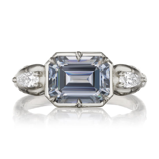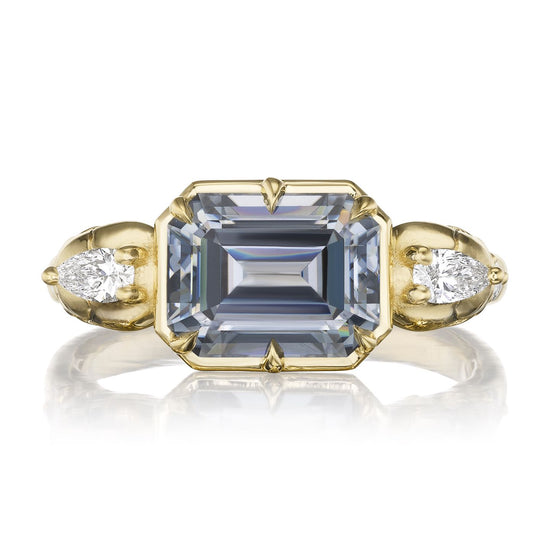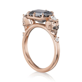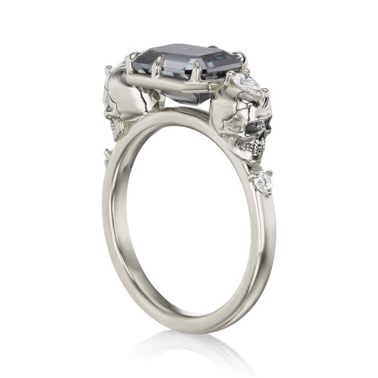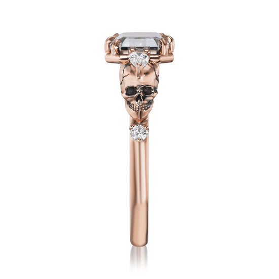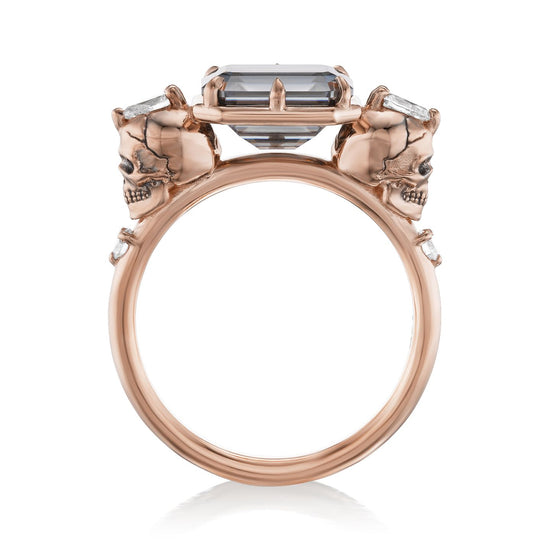 Part of the 'Til Death collection, the Juliet marries Kristin's aesthetic with inspiration from antique memento mori jewelry. Featuring intricate solid gold skulls that frame a floating east-west set emerald cut grey Iconic™ moissanite. Each skull is adorned with a pear shaped diamond and additional shank diamond accents. Option to customize the shank stones with birthstones to symbolize the special souls in your life.