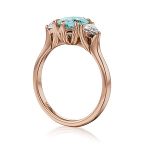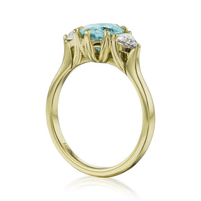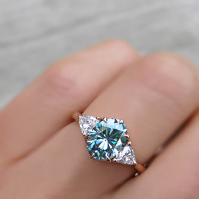 The Juno three-stone ring is the perfect blend of edgy-meets-classic. Featuring an oval aqua-teal Iconic™ moissanite center, framed by conflict-free trillion shaped lab-grown diamonds. Aqua-teal moissanite is a more durable and sparkling alternative to an aquamarine gemstone, making it a perfect ring choice.