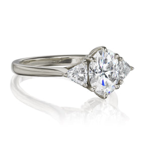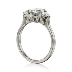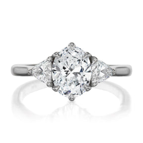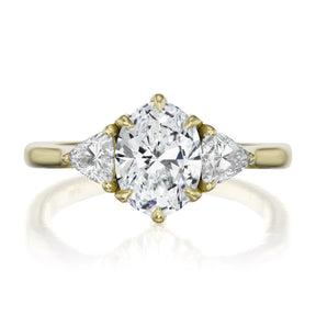 An engagement ring with a clear conscience: the Juno three-stone ring is the perfect blend of ethical-meets-classic. Featuring a conflict-free oval lab-grown diamond center, framed by trillion shaped lab-grown diamonds.