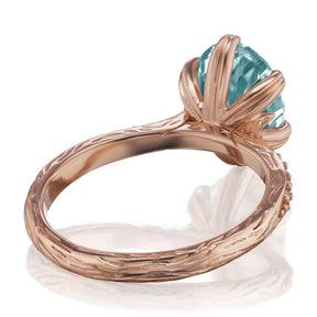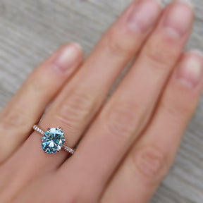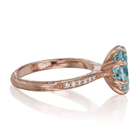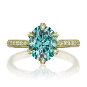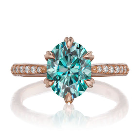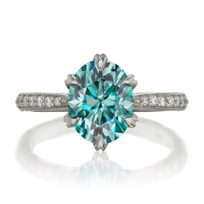 The Layla’s leaf-inspired prong setting and twig textured shank put a unique twist on the classic solitaire design. Featuring an oval Iconic™ aqua-teal moissanite, framed by conflict-free lab-grown or Canadian mined diamonds. Aqua-teal moissanite is a more durable and sparkling alternative to an aquamarine gemstone, making it a perfect ring choice.