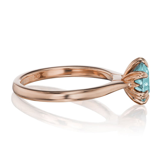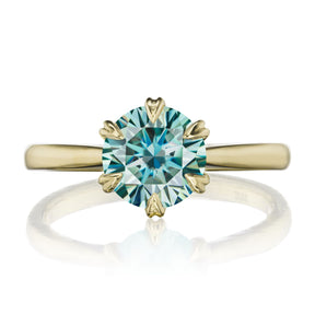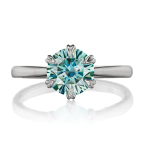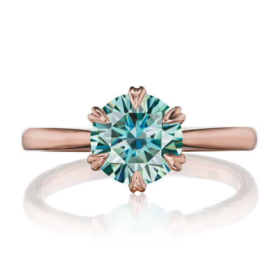 The Leona's leaf-inspired prong setting puts a unique twist on the classic solitaire design. Featuring a Hearts & Arrows Iconic™ aqua-teal moissanite, and available with or without diamonds in the shank. Accent diamonds available in conflict-free Canadian mined or lab-grown. Aqua-teal moissanite is a more durable and sparkling alternative to an aquamarine gemstone, making it a perfect engagement ring choice.