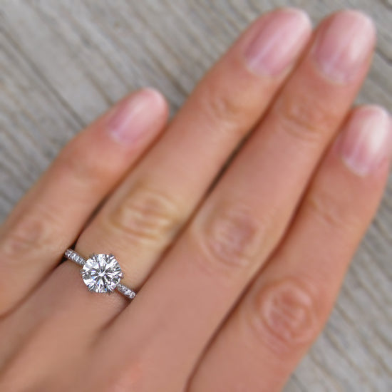 The shank, or the band portion of an engagement ring, is available with or without diamonds set into it. Selecting no diamonds in the shank means the shank will be a plain, smooth, polished band. If you'd like diamonds in the shank, you have the option of lab-grown, or mined Canadian origin. Both of these diamond options grade the same in clarity and color, and therefore are visually identical. The only difference is their origin, as one option is lab-created, and the other is earth-mined from the Canadian artic. Learn more about lab-grown diamonds here. Learn more about Canadian mined diamonds here. Selecting diamonds in the shank means that 6 diamonds will be set on either side of the center stone, extending approximately halfway down the shank.