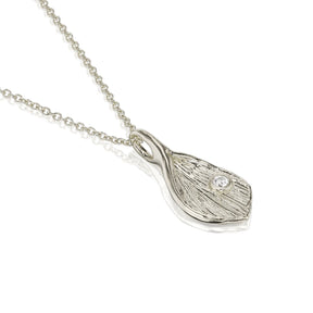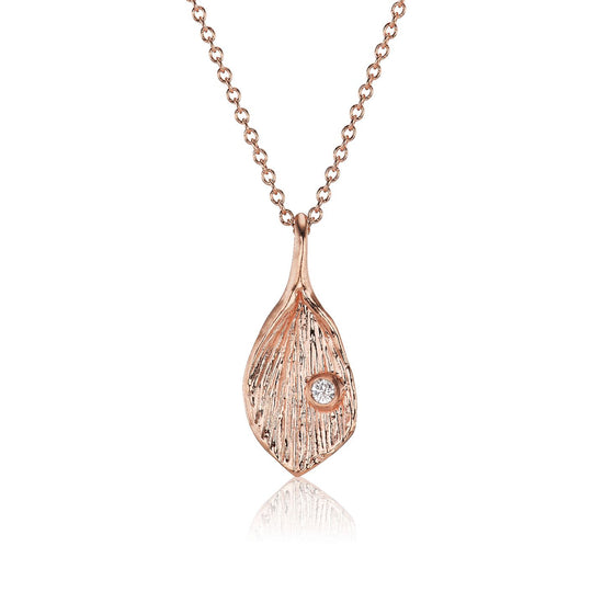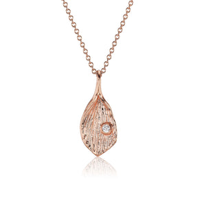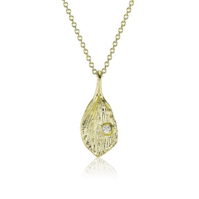 A single Lotus petal is dotted with a single diamond dew drop. The petal was hand-carved and sculpted as a reminder of lightness, new beginnings, and clarity. Cast in your choice of gold color, making this a truly ethically-inspired piece.