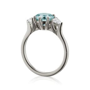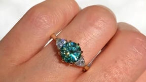 The Magnolia three-stone ring is the perfect blend of edgy-meets-classic. Featuring a Hearts & Arrrows aqua-teal Iconic™ moissanite center, framed by conflict-free trillion shaped lab-grown diamonds. Aqua-teal moissanite is a more durable and sparkling alternative to an aquamarine gemstone, making it a perfect ring choice.