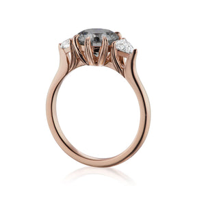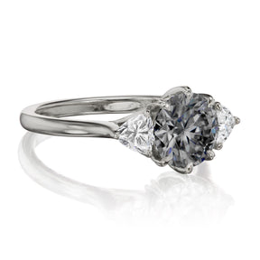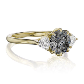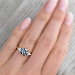 The Magnolia three-stone ring is the perfect blend of edgy-meets-classic. Featuring a Hearts & Arrrows grey Iconic™ moissanite center, framed by conflict-free trillion shaped lab-grown diamonds.