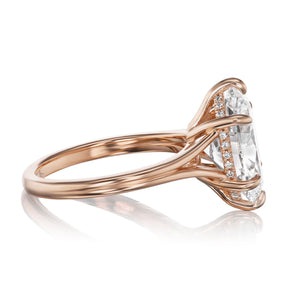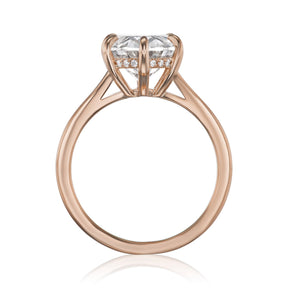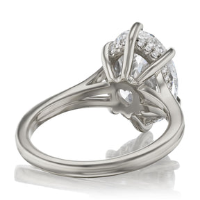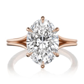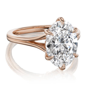 The Ophelia is a modern and ethical take on a classic oval solitaire. Featuring an elegant split shank that frames an oval Everlūm® lab-grown diamond. A hidden halo of conflict-free lab-grown or Canadian mined diamonds encrusts the sides of the 6-prong setting.
