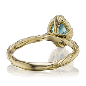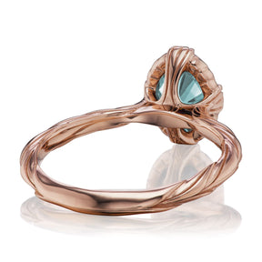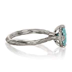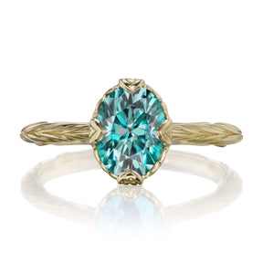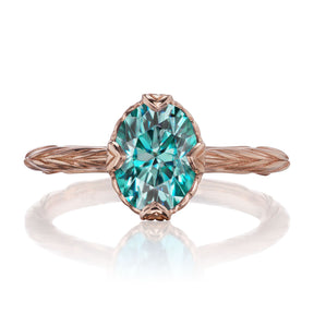 The Olivia is the perfect mix of organic-meets-refined. The floral basket setting and willow leaf-inspired shank put a unique twist on the classic solitaire design. Featuring an oval Iconic™ aqua-teal moissanite, the Olivia is as ethical as it is sparkling. Aqua-teal moissanite is a more durable and sparkling alternative to an aquamarine gemstone, making it a perfect engagement ring choice.