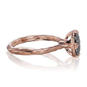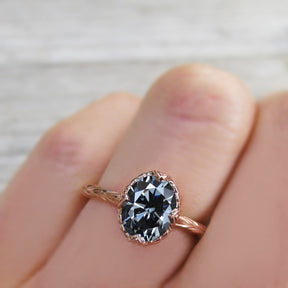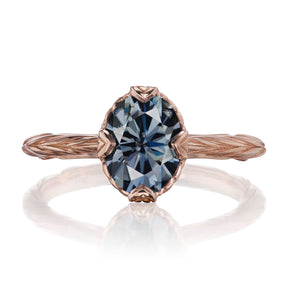 The Olivia is the perfect mix of organic-meets-refined. The floral basket setting and willow leaf-inspired shank put a unique twist on the classic solitaire design. Featuring an oval Iconic™ grey moissanite, the Olivia is as ethical as it is sparkling.