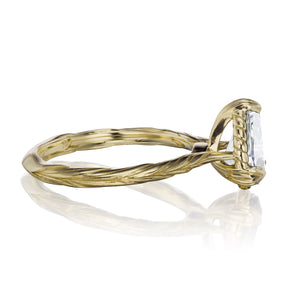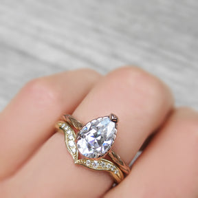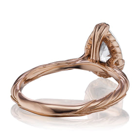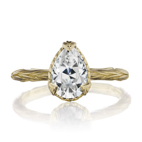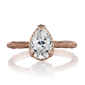 The Fiona is the perfect mix of organic-meets-refined. The floral basket setting and willow leaf-inspired shank put a unique twist on the classic solitaire design. Featuring a pear Forever One™ moissanite, the Fiona is as ethical as it is sparkling.