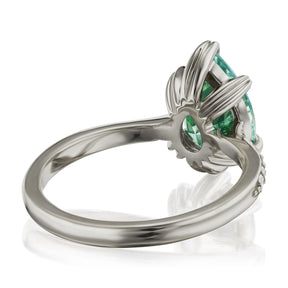 The Petra's leaf-inspired prong setting puts a unique twist on the classic solitaire design. Featuring a pear shaped, light aqua-teal Iconic™ moissanite, framed by conflict-free lab-grown or Canadian mined diamonds. Aqua-teal moissanite is a more durable and sparkling alternative to an aquamarine gemstone, making it a perfect ring choice.