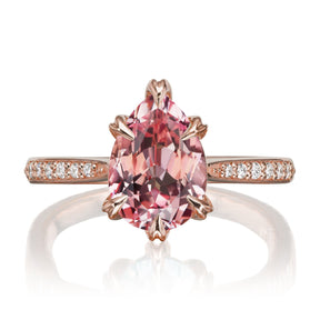 The Petra's leaf-inspired prong setting puts a unique twist on the classic solitaire design. Featuring a pear shaped Chatham® lab-grown peach-champagne sapphire center, framed by conflict-free lab-grown or Canadian mined diamonds.