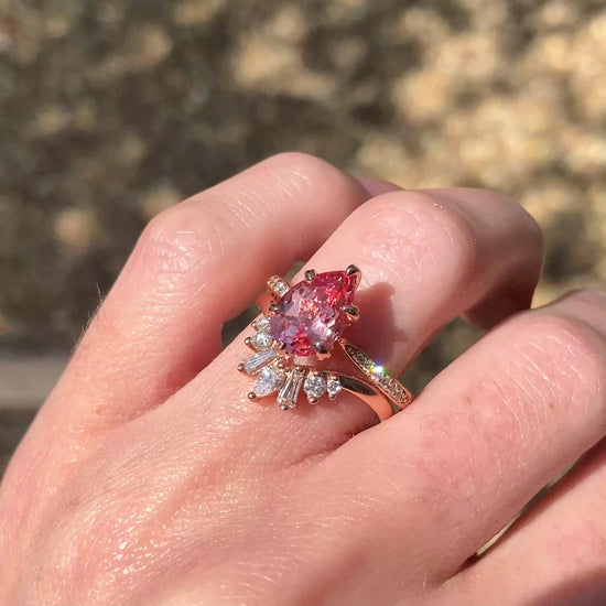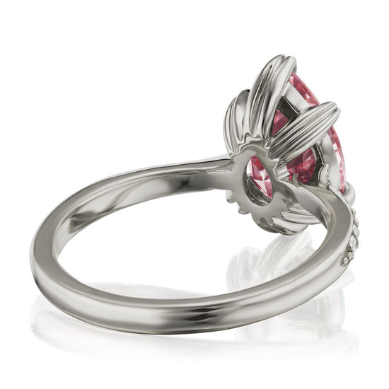 The Petra's leaf-inspired prong setting puts a unique twist on the classic solitaire design. Featuring a pear shaped Chatham® lab-grown peach-champagne sapphire center, framed by conflict-free lab-grown or Canadian mined diamonds.