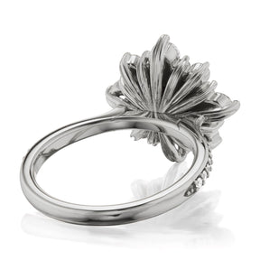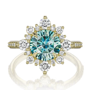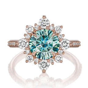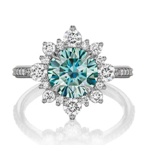 The vintage-inspired large Reyna makes a statement engagement ring or treat-yourself gift. Featuring a Hearts & Arrows aqua-teal Iconic™ moissanite center, accented by conflict-free lab-grown or Canadian mined diamonds. Aqua-teal moissanite is a more durable and sparkling alternative to an aquamarine gemstone, making it a perfect ring choice.