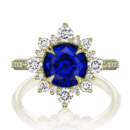 The vintage-inspired large Reyna makes a statement engagement ring or treat-yourself gift. Featuring a round Chatham® lab-grown blue sapphire, accented by conflict-free lab-grown or Canadian mined diamonds.