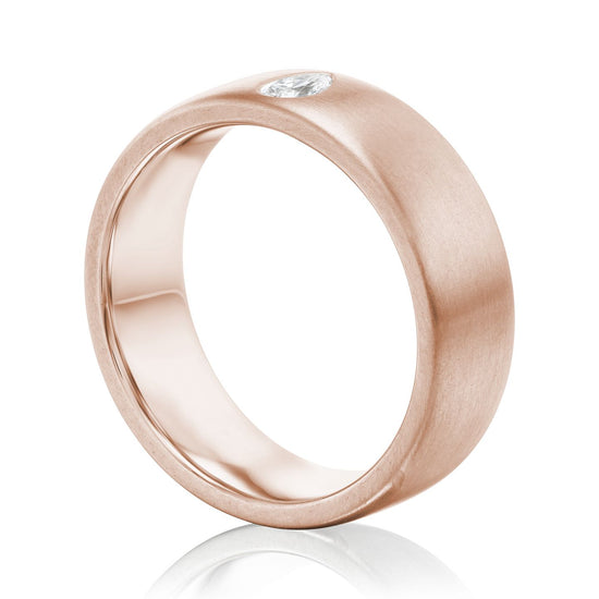 The wide River band is the perfect mix of classic-meets-modern. Featuring a brushed matte satin finish with a contrasting brilliant lab-grown white pear shaped diamond. This band is substantial in weight and feel, and so comfortable to wear.