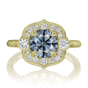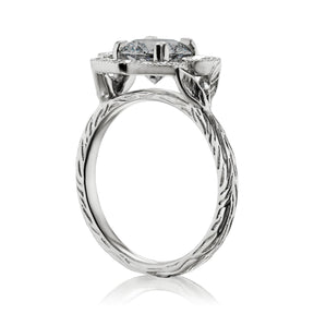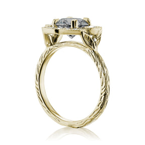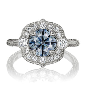 The vintage-inspired Sadie makes a statement engagement ring or treat-yourself gift. Featuring a Hearts & Arrows grey Iconic™ moissanite center, accented by conflict-free lab-grown or Canadian mined diamonds. The shank features a twig and leaf motif with a tiny diamond nestled into each side.