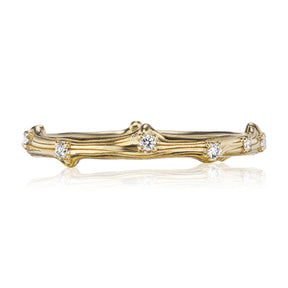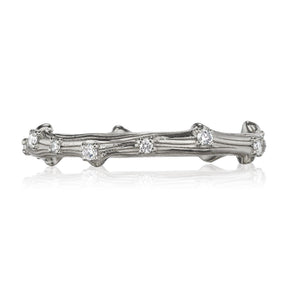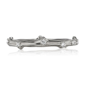 Real twigs were molded and cast, then hand carved to create the inspiration for this unique band. Cast in your choice of solid recycled gold or platinum, then set with conflict-free diamond dew drops scattered all around the twig. Beautiful on its own or as a wedding band, or wear it alongside your favorite rings to create your own unique, stackable collection.