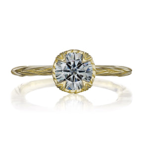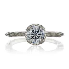The Sienna is the perfect mix of organic-meets-refined. The floral basket setting and willow leaf-inspired shank put a unique twist on the classic solitaire design. Featuring a Charles & Colvard grey moissanite, the Sienna is as ethical as it is sparkling. Charles & Colvard stopped making the greys several years ago, so they are in extremely limited supply.