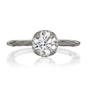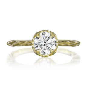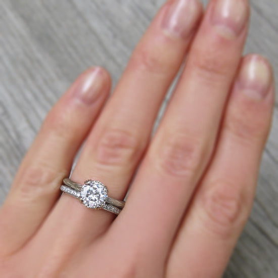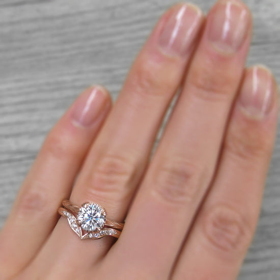 The Sienna is the perfect mix of organic-meets-refined. The floral basket setting and willow leaf-inspired shank put a unique twist on the classic solitaire design. Featuring your choice of moissanite: Forever One™ from Charles & Colvard, or Supernova™ from Moissanite International.