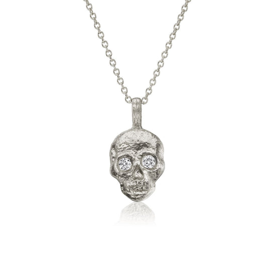 A symbol of love 'til death do us part, and also of our impermanence on this earth. Hand carved and cast in 14k recycled rose, white, and yellow gold with two ethically sourced mined diamonds set into the eyes. A contemporary take on the memento mori jewelry of centuries past.