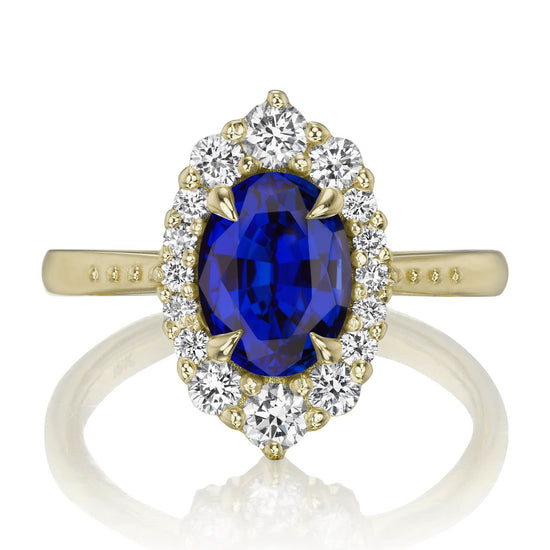 The vintage-inspired midsize Sofia makes a statement engagement ring or treat-yourself gift. Featuring an oval Chatham® lab-grown blue sapphire, accented by conflict-free lab-grown or Canadian mined diamonds.