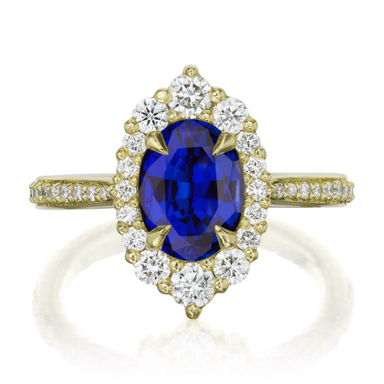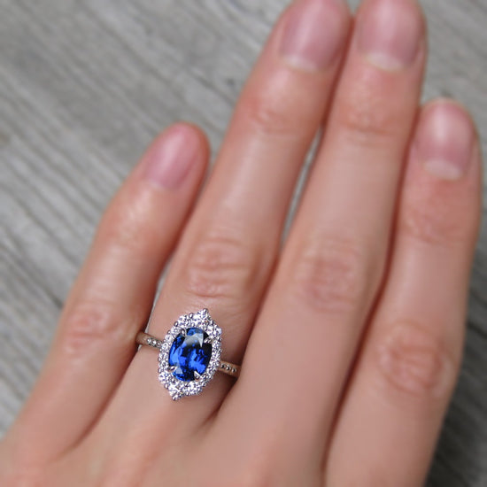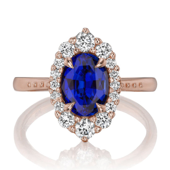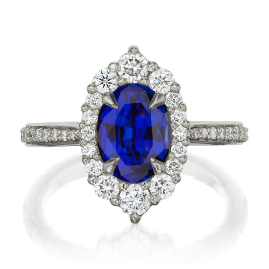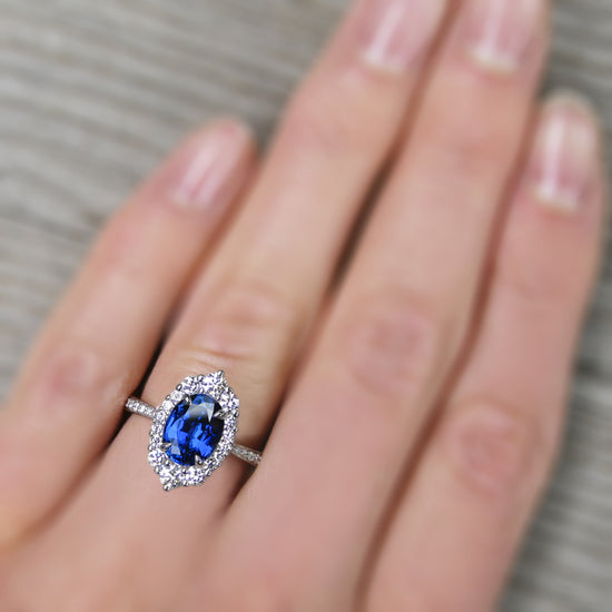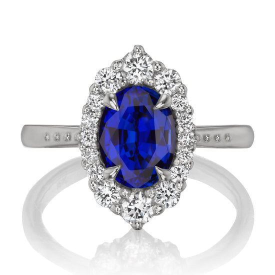 The vintage-inspired midsize Sofia makes a statement engagement ring or treat-yourself gift. Featuring an oval Chatham® lab-grown blue sapphire, accented by conflict-free lab-grown or Canadian mined diamonds.