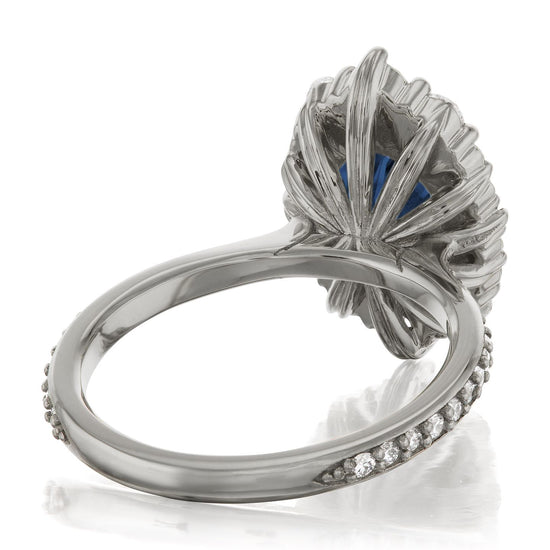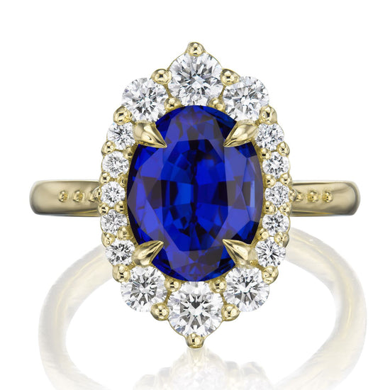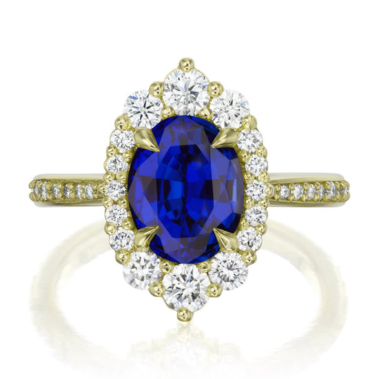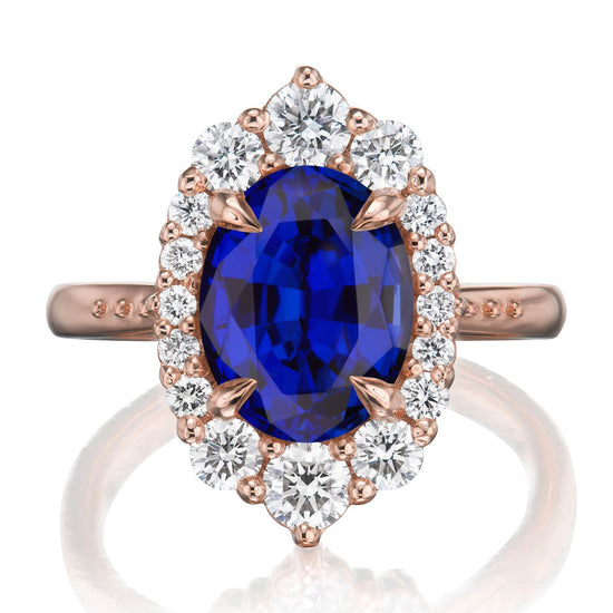 The vintage-inspired large Sofia makes a statement engagement ring or treat-yourself gift. Featuring an oval Chatham® lab-grown blue sapphire, accented by conflict-free lab-grown or Canadian mined diamonds.