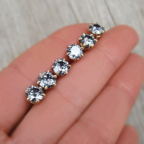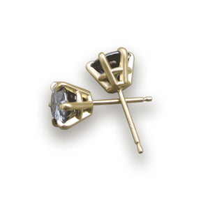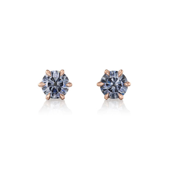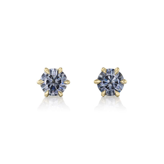 Six prong studs get a modern update with grey moissanite, claw-shaped prongs, and a matte satin finish. Charles & Colvard discontinued the greys a several years ago, so they are in extremely limited supply. These greys are very chameleon-like, changing from a medium grey in some lighting to a deeper steel-grey in other lighting. Some are eye-clean, while others have subtle micropiping inclusions, which occur naturally during the crystal growing process.